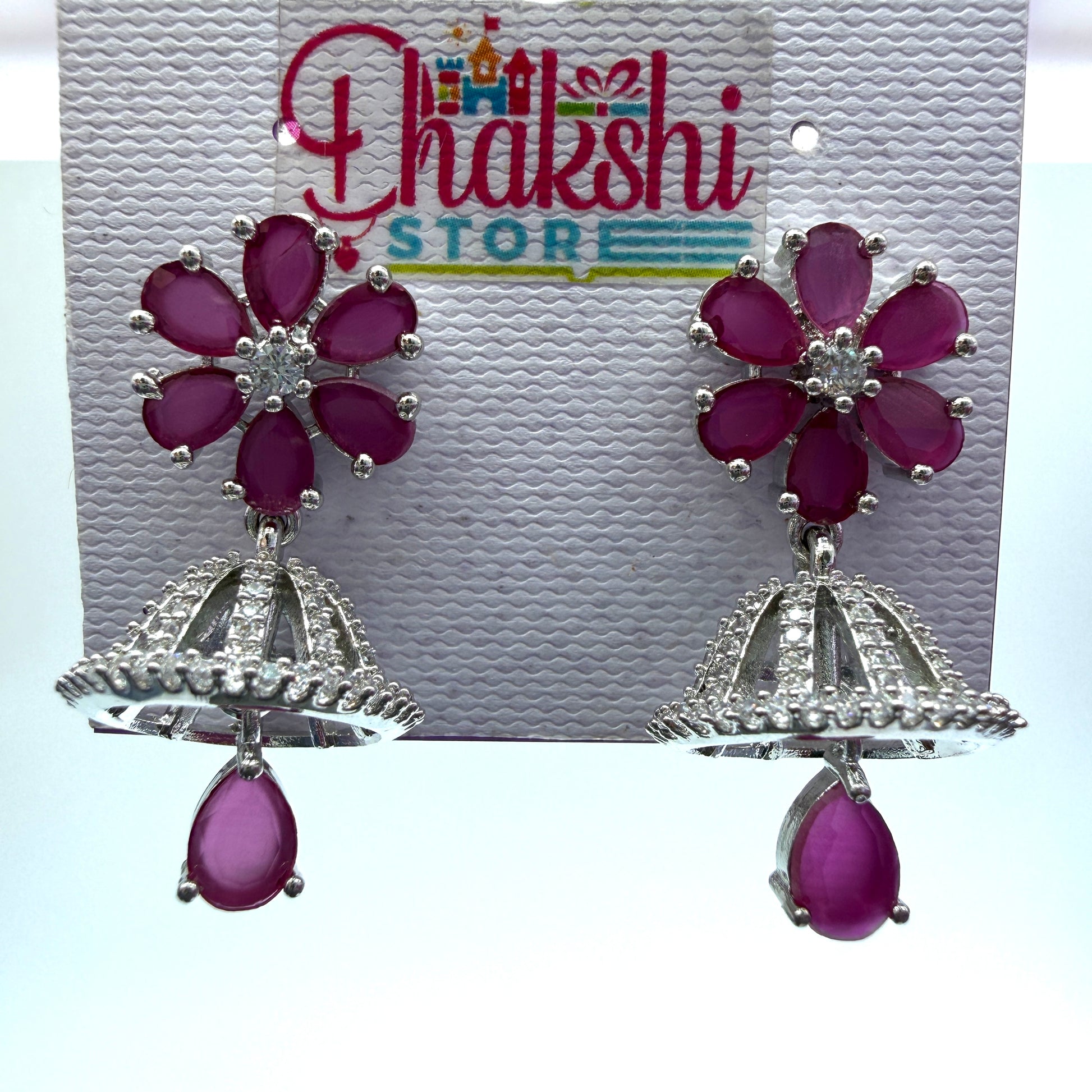 The delicate silver-finish jhumka dome is decorated with fine detailing and crystals, giving the earrings a graceful appearance. The design is completed with a pink teardrop pendant, adding charm and movement.