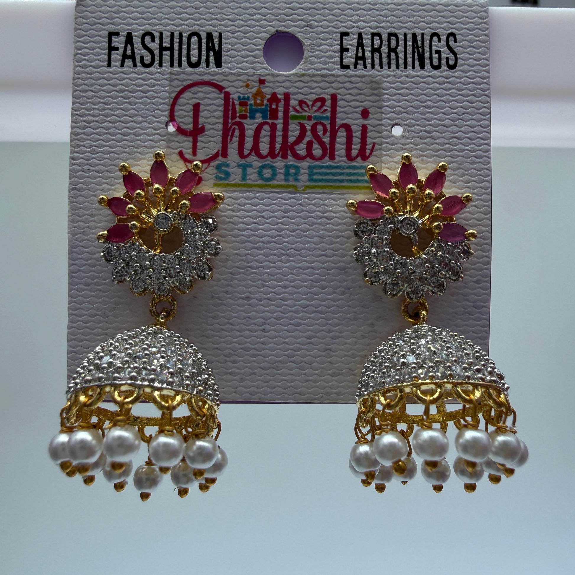 The dome-shaped jhumka is decorated with shimmering stones and finished with classic pearl drop hangings, making it perfect for festive and party occasions.