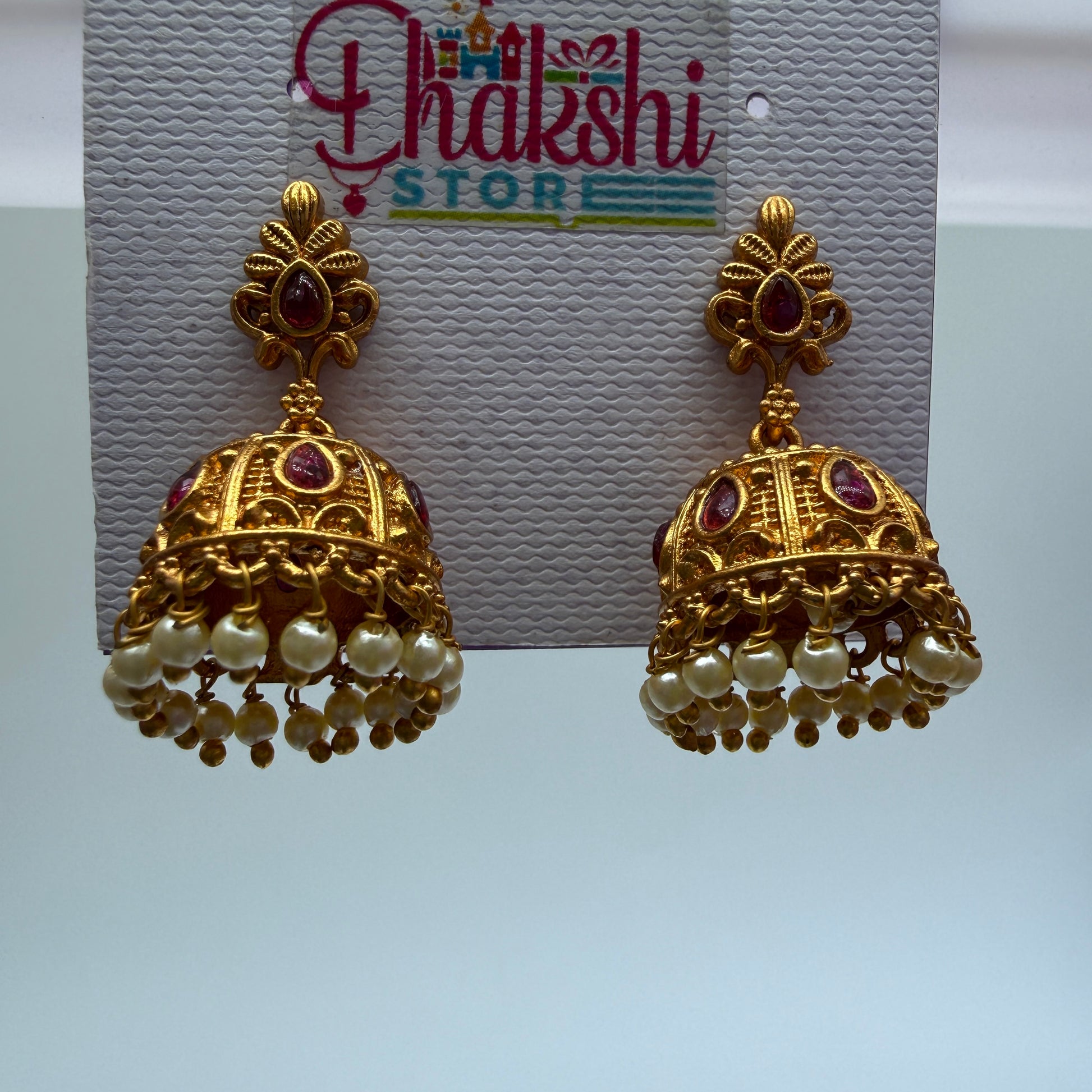 Traditional Gold Ruby Stone Jhumka Earrings with Pearl Drops – Temple Style